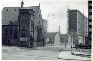 St Timothy's church seen here from Everton Brow looking along Rokerby Street. The corner of John F. Kennedy Heights can just be seen as the Piggeries high rise are constructed on William Henry Street behind. The steeple of SFX church can be seen up on Langsdale Street.